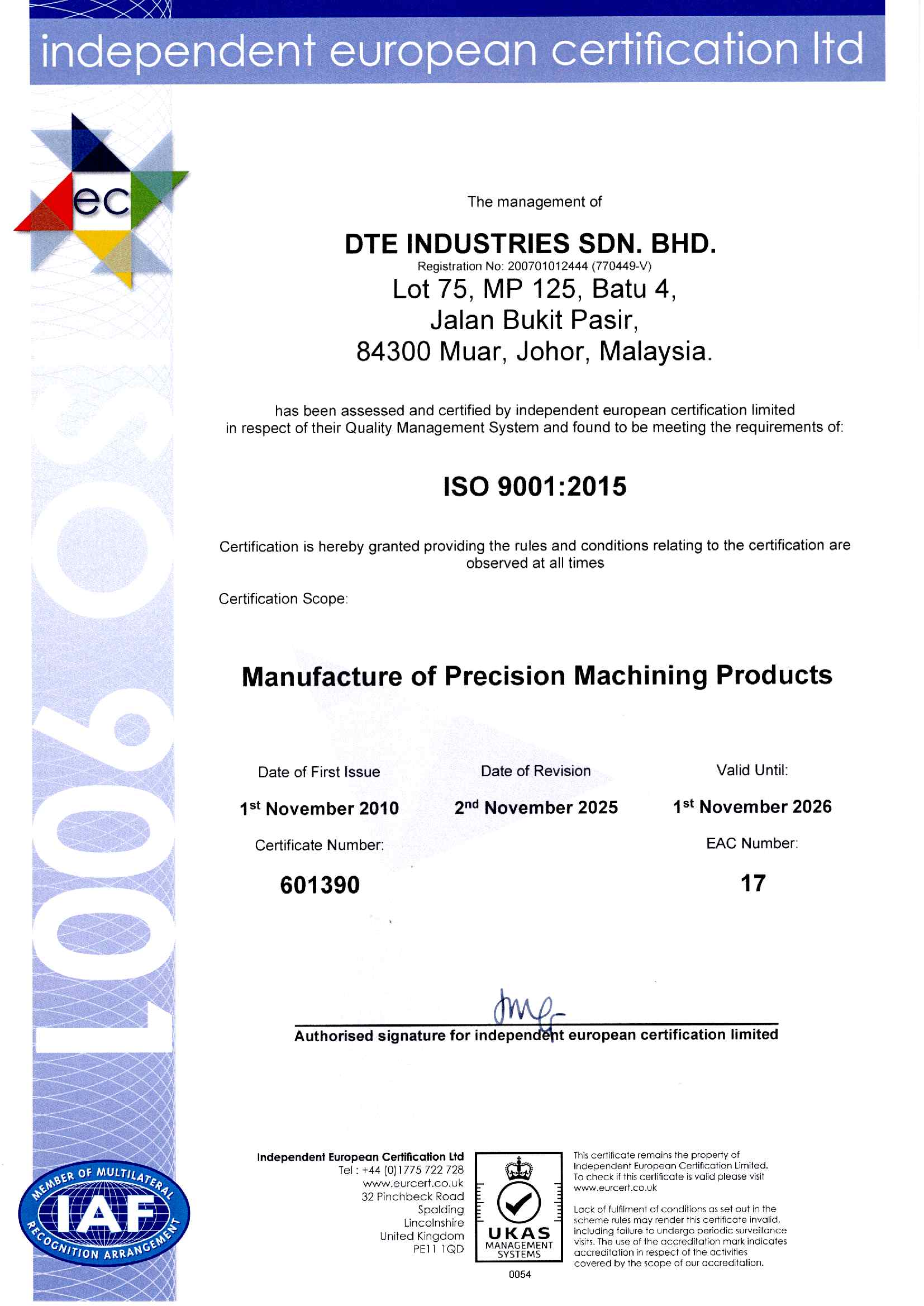 Our company received the ISO 9001:2008 Certification for Quality System Management as a Manufacturer of Machine Products (Tooling & Machine Components) since 2010. This is testament to our commitment to deliver excellent quality products and services.